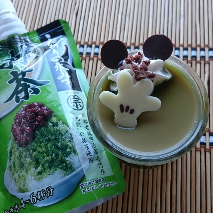 ミルクプリンに、夏買って使ってなかったかき氷の抹茶シロップを少しかけました。最後にホイップとチョコプレートをのせて☆