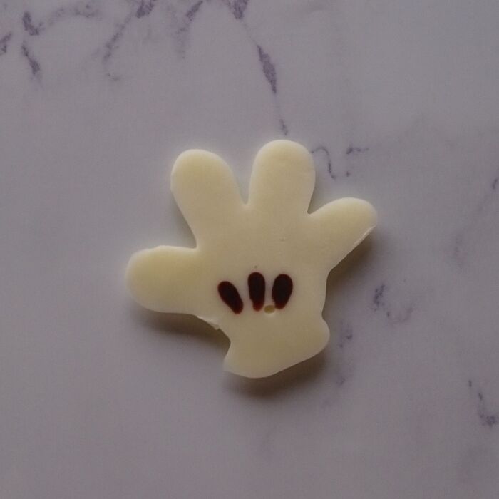 ミッキーの手は、クッキングシートに茶色のチョコペンで線を3本描いたあと、固まったら白のチョコペンで手を描いていきます。耳は茶色のチョコペンで丸を描いて塗りつぶすだけ。描けたら冷蔵庫で冷やして固めます。
