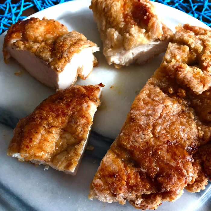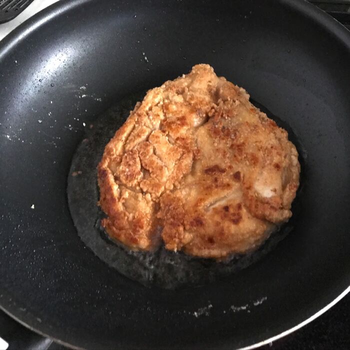 ②を入れ両面がカリッとなるように揚げます。肉の厚さによりますが、15分ぐらいかかると思います。