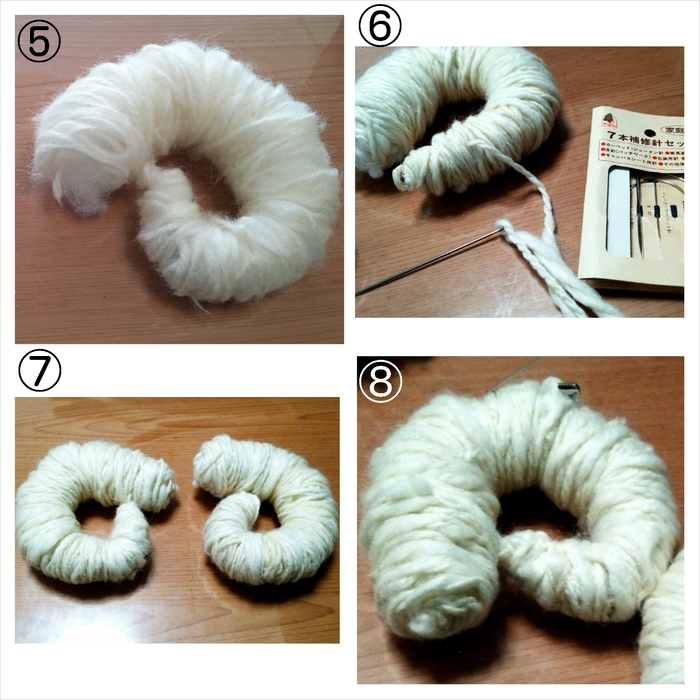④ワタを巻き付け、それを覆うように毛糸を巻き付けて行きます。