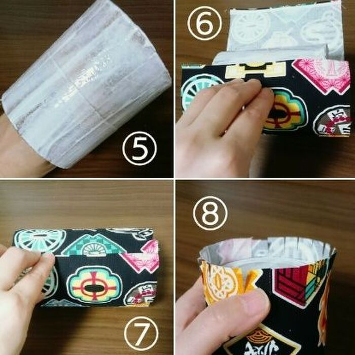 ガムテープ2つ分の高さ+4㎝、幅ガムテープの外円周+1.5㎝(端から5㎜のところで折ってアイロンをかけておく)