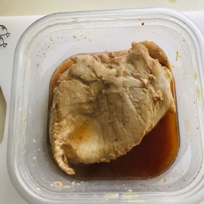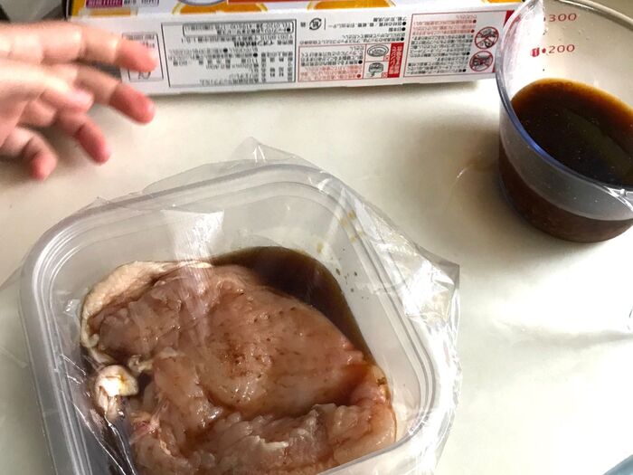 焼肉のタレに漬け込みよく全体的に鶏胸肉をもみもみしてください。