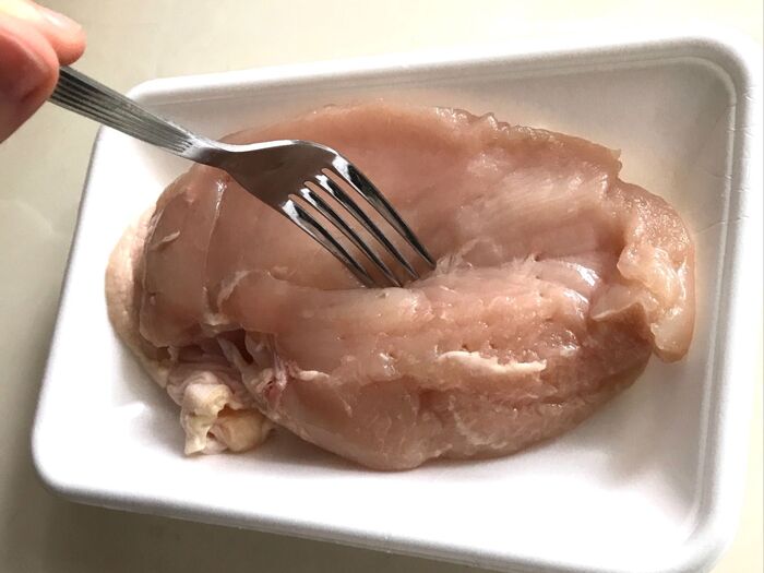 鶏胸肉を両面フォークでブツブツさしていきます。