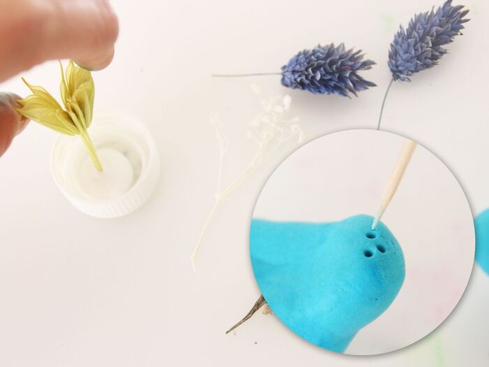 1.丸と円柱をドライフラワーの茎又は爪楊枝を土台に挿してボンドで接着し補強