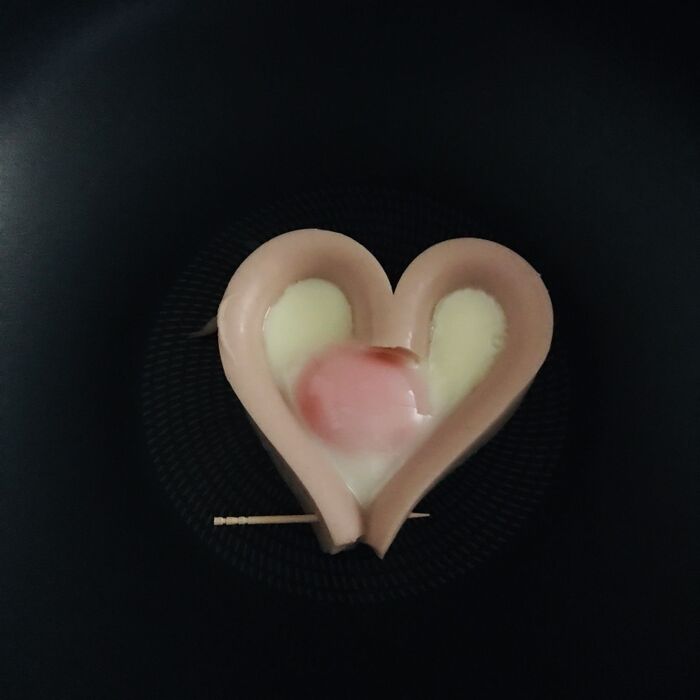 卵は小鉢に入れハートの魚肉ソーセージのなかに白身が均等になるように入れます。