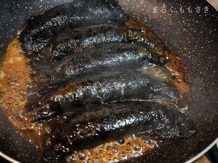 蓋を開け★を入れ両面を強火でさっと煮詰める。