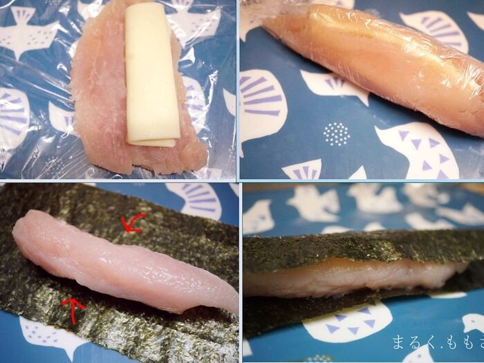 ③海苔の真ん中にささみを置き(チーズの見える部分を底にする)