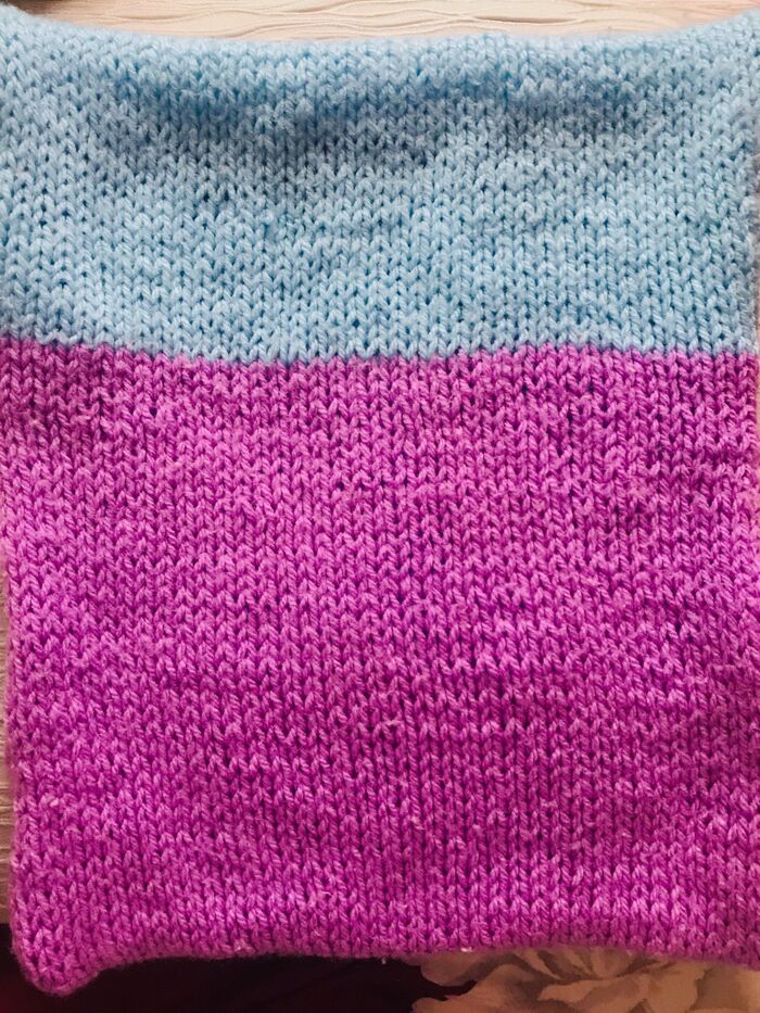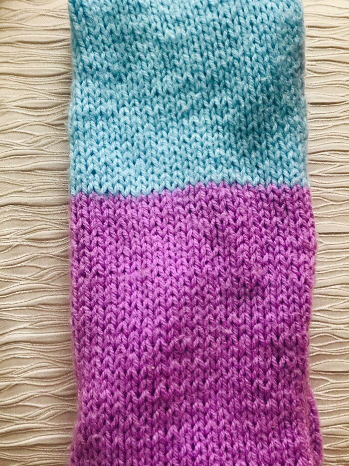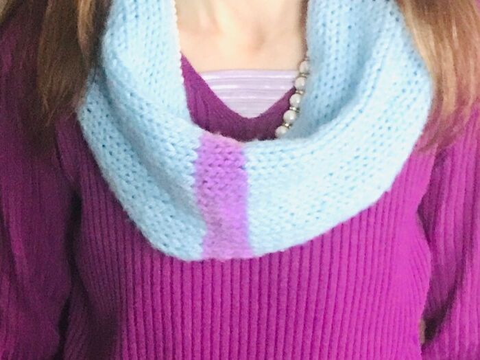 棒編みで縦120cm、横40cmくらいに表編みで編みます。毛糸針で閉じて、輪になるように