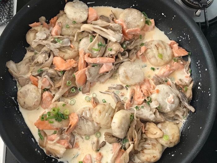 ⑤熱したフライパンにバターを溶かし、皮を取った鮭、舞茸を炒める。