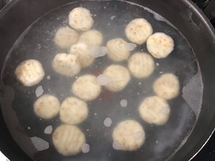 ④鍋に沸かした湯に入れて、茹で、浮いてきたら、掬い取る。