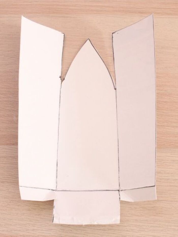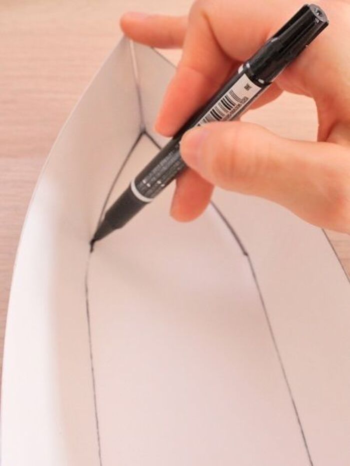 ・切り取ったら、両サイドを合わせてテープで仮止めし、船底の形を下描きします。