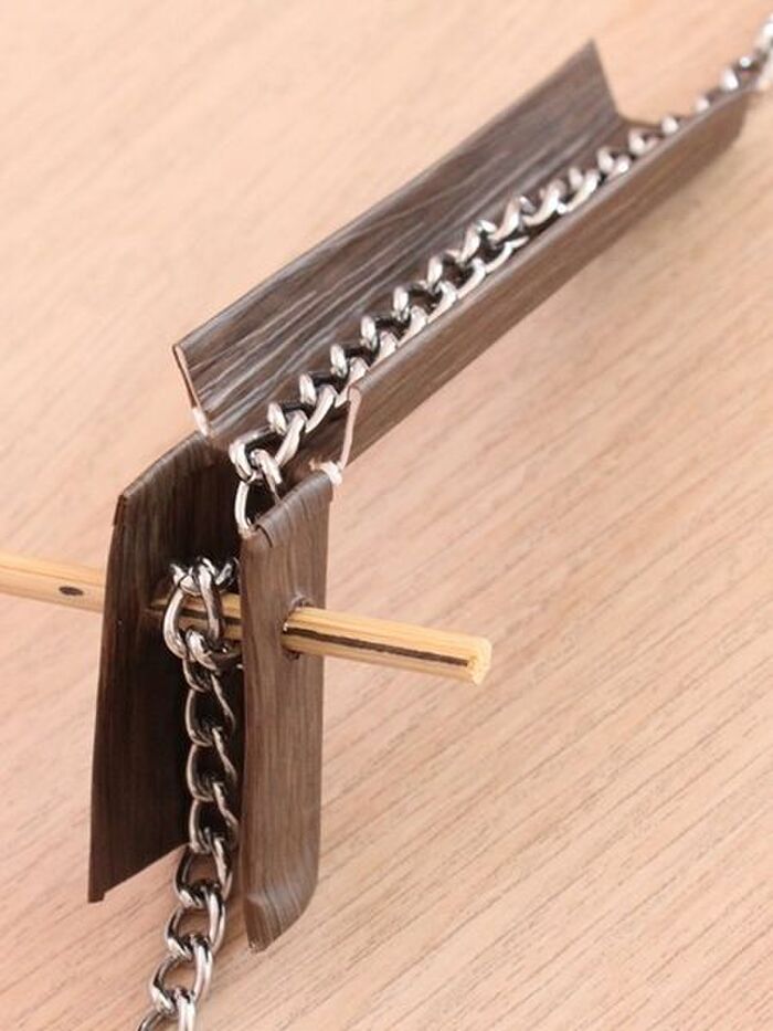 ※竹串が軸になって、チェーンを巻きとったり、引っぱって外に伸ばしたりできる仕組みです。