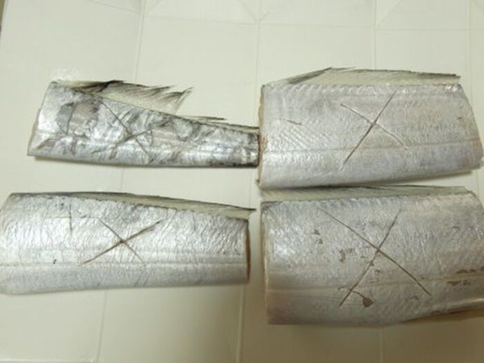 太刀魚は内臓を取り、ぶつ切りにします。しっかり水気を拭き取り、包丁で切り込みを入れます。