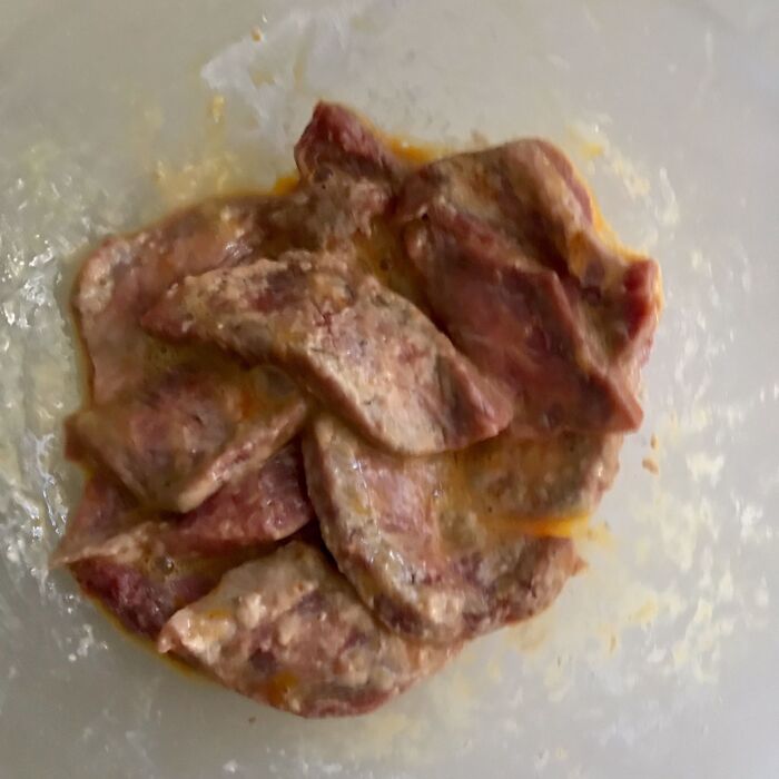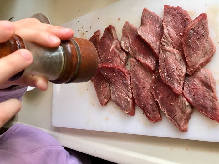 包丁でライスしてフォークでブツブツさし、塩胡椒します。