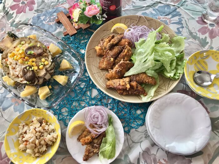 レタス、スライスしたアーリーレッド、レモンのくし形切りを添えて盛り付けます。