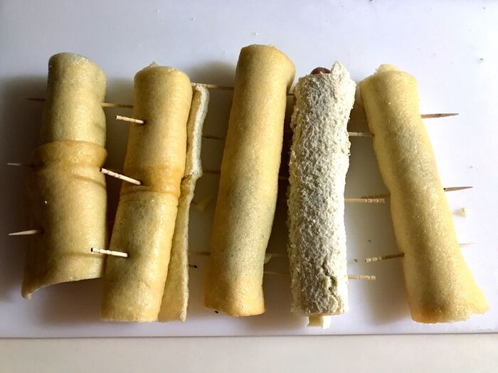 くるくると巻き、爪楊枝で3箇所留めます。