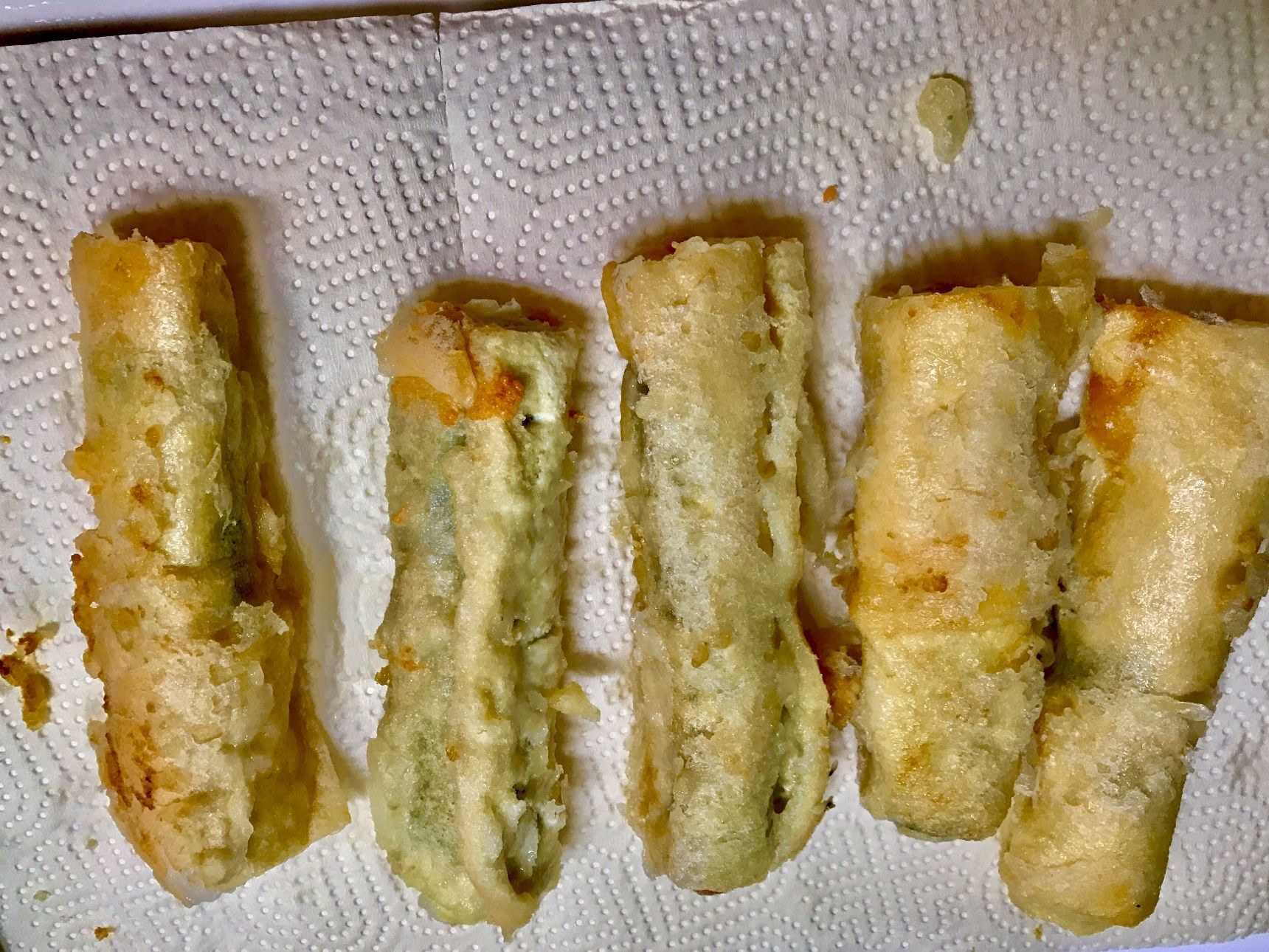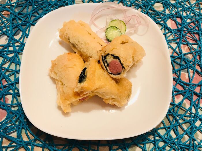 薄力粉に水を入れ衣を作り、中温でキツネ色になるまで揚げます。
