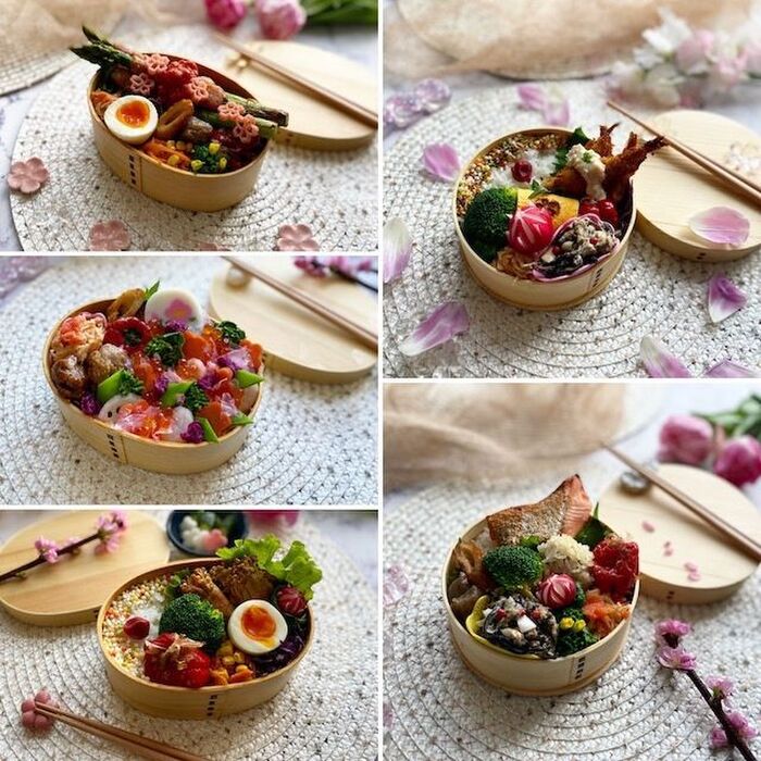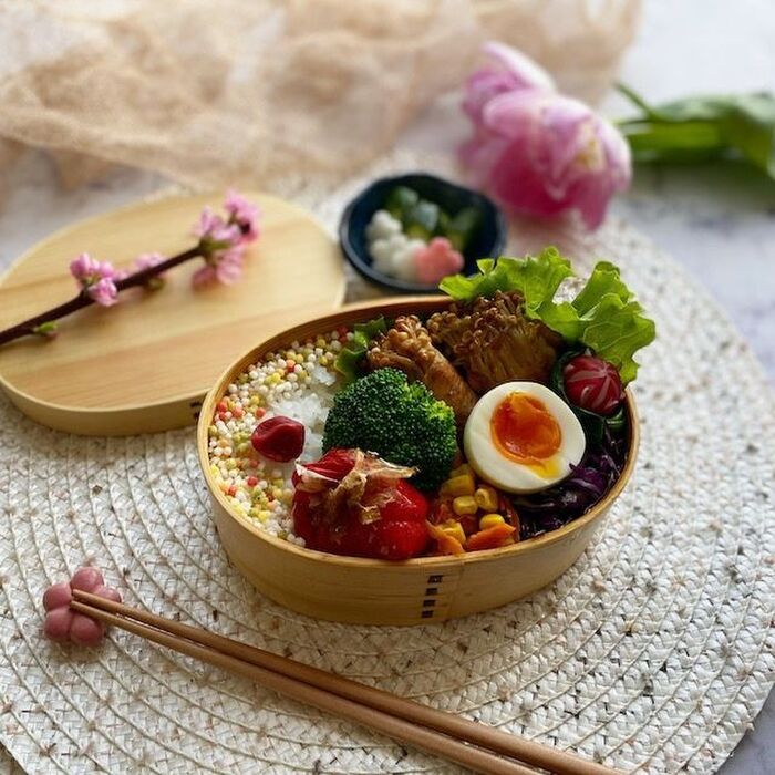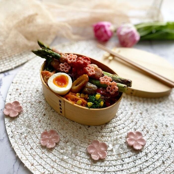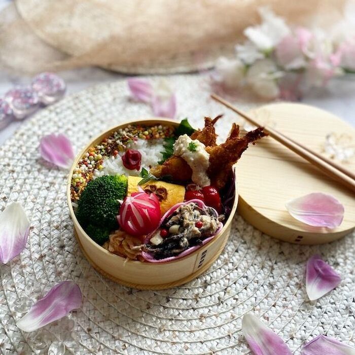 上には 卵焼き 酢レンコン 梅型人参 エビ 絹さや 菜の花