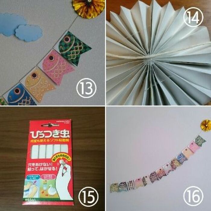 ⑮くっつき虫を使えば、⑭なしで壁に飾れます。