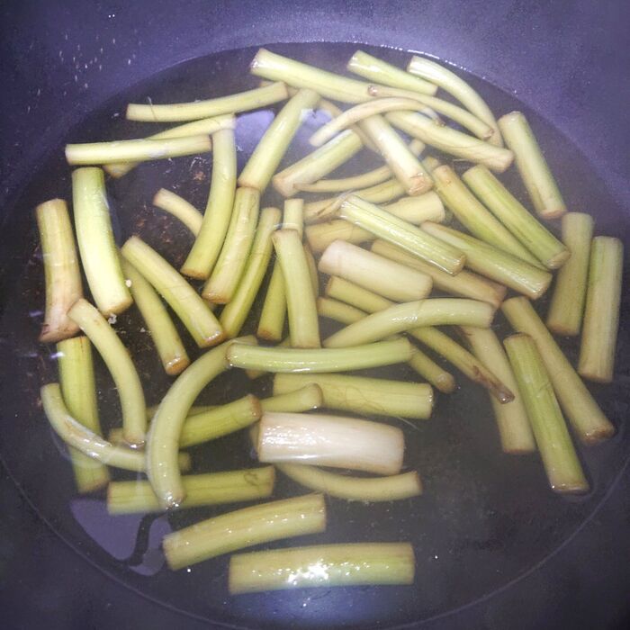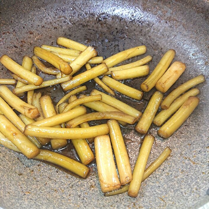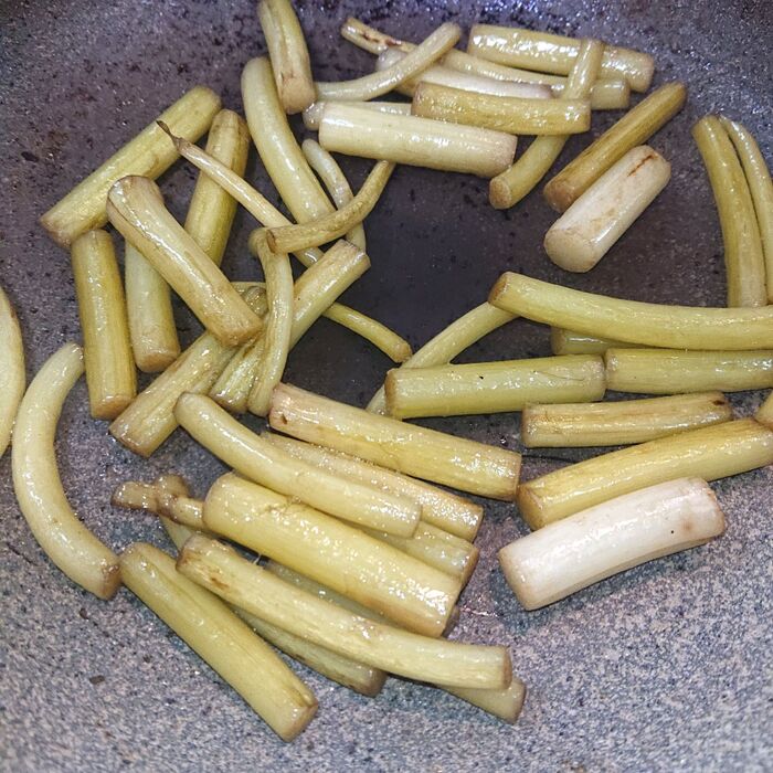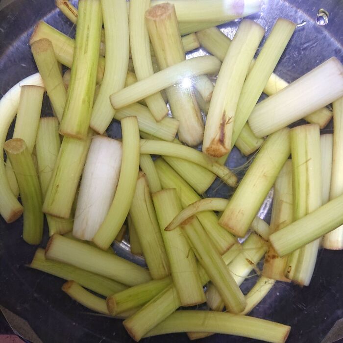 ごま油を熱したフライパンにつわを加えて、火が通るまで炒める。