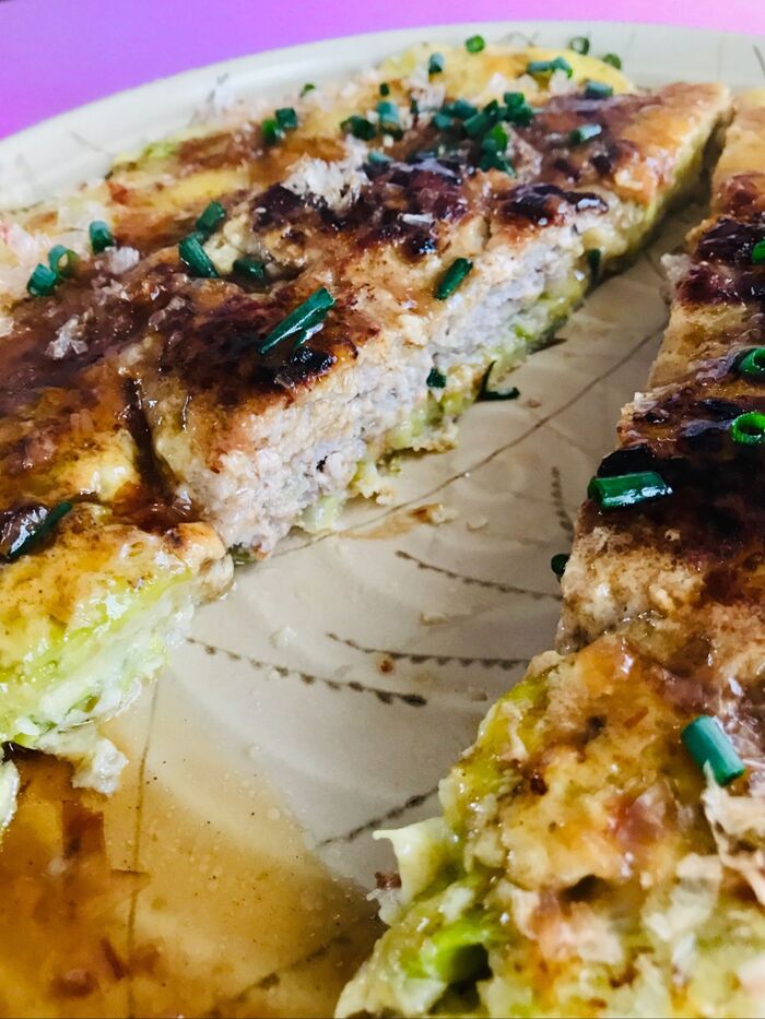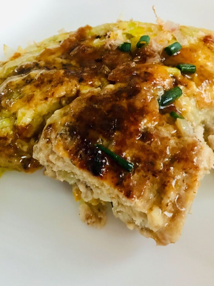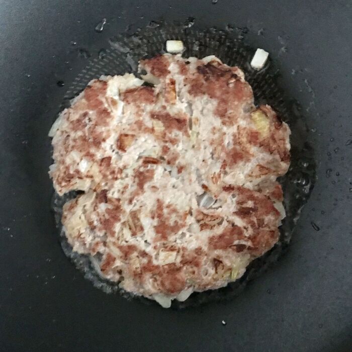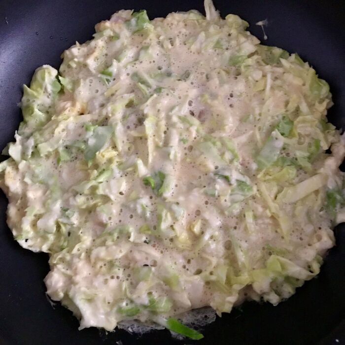 ハンバーグの上にお好み焼きの生地を流し入れます。蓋をしてじっくり焼いていきます。