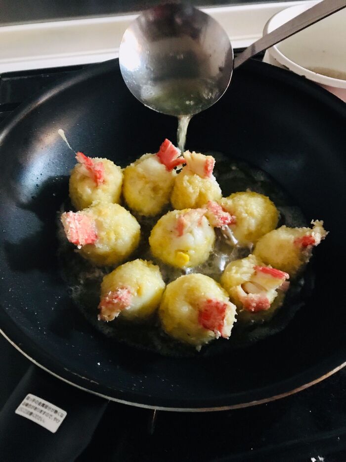 揚げます。ひっくり返すことが難しいので、お玉で油をかけます。