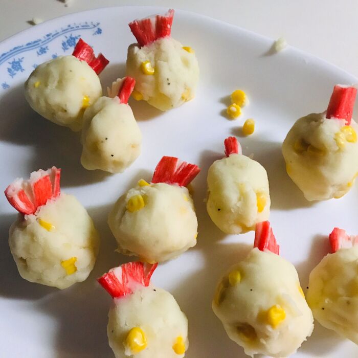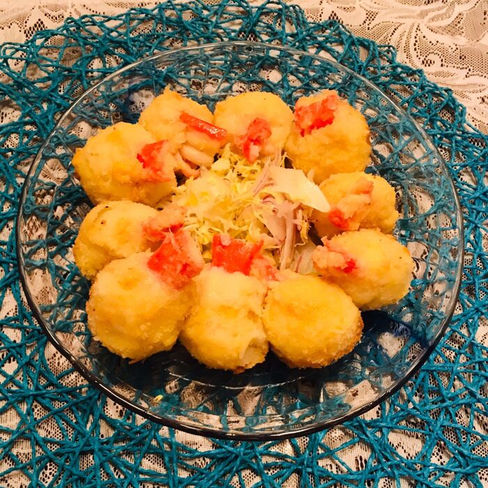 ②①を丸めカニカマを半部に切ったものを少し見えるようにまとめます。