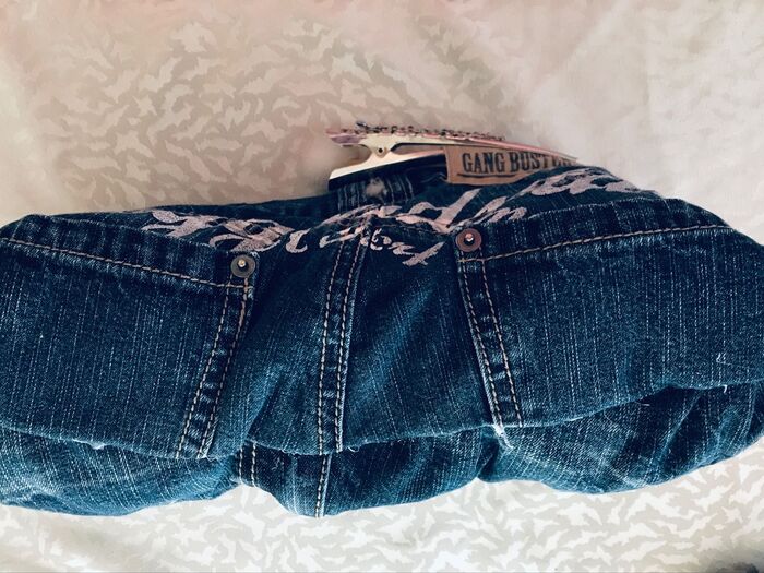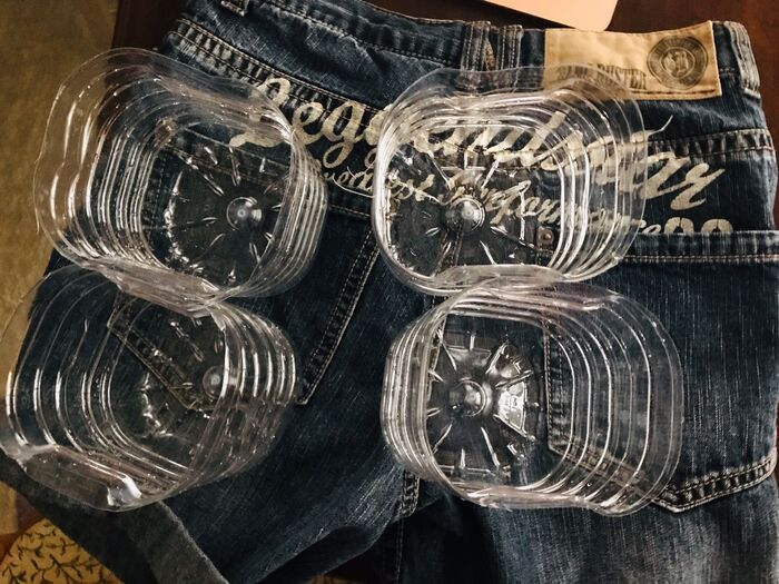 ②①をデニムのパンツのウエスト部分に入れ、ペットボトルが隠れるところまで持ち上げます。余分な脚部分のデニム切り落とします。