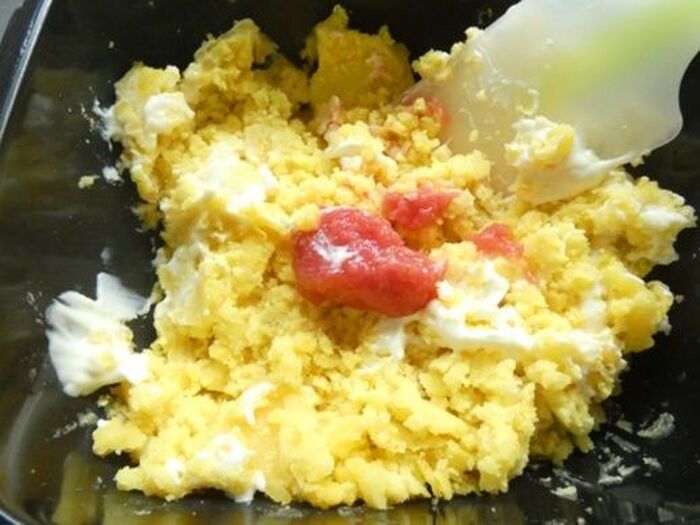 マヨネーズときざみ紅しょうが風ペースト、塩こしょうを混ぜ合わせます。