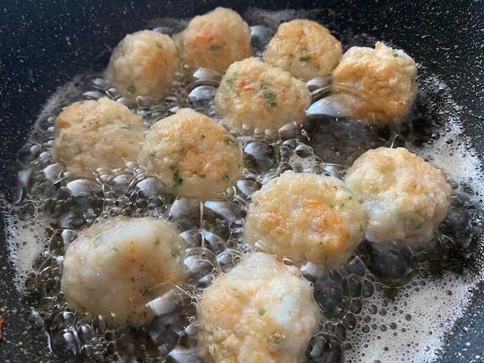 揚げオイルをフライパンに1cmぐらい入れ丸めたエビを転がしながら