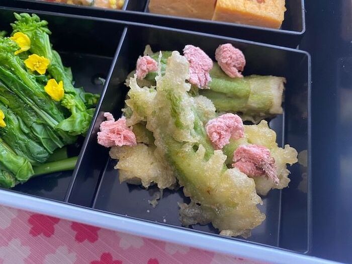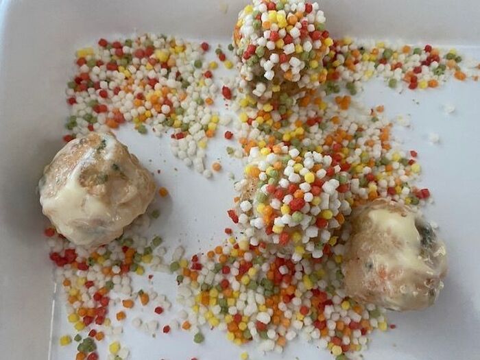 aを混ぜ合わせ揚げたエビに薄く絡め ぶぶあられを全体にまぶす