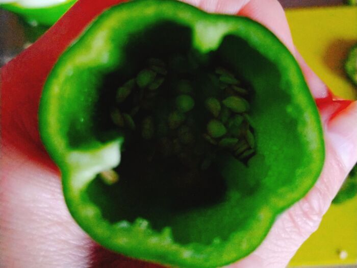 2.ピーマンはヘタ部分を5㎜程切り落とし種とワタを指でピーマンの下までグッと押し込む。