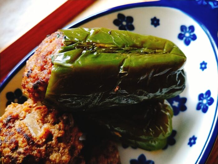 6.ピーマンの中に肉タネをたっぷり注入する。はみ出た部分は形を整える。余った肉タネは肉団子にする