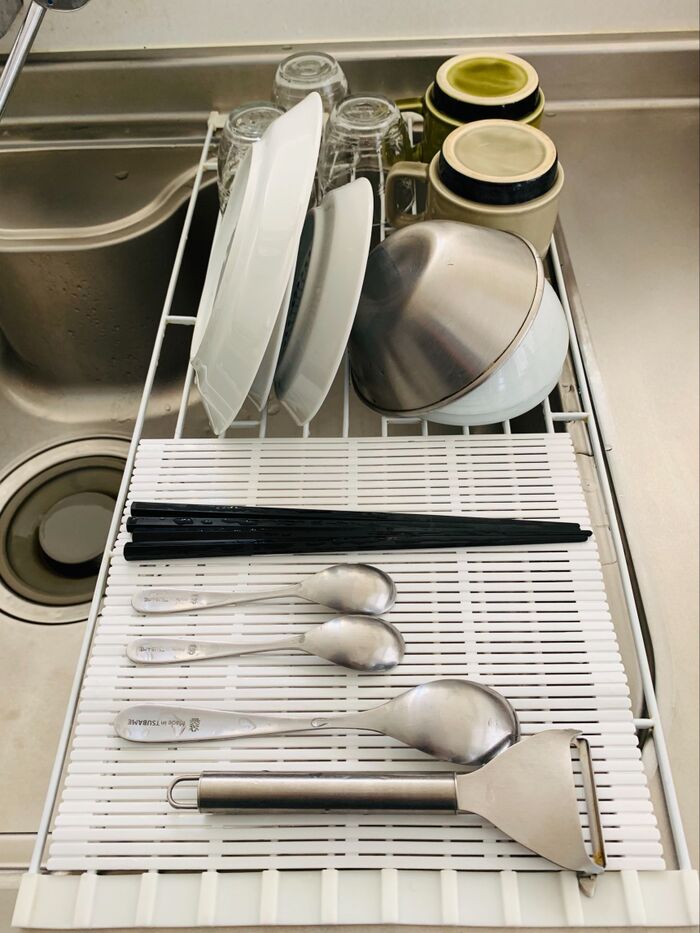 シンクに直接水が落ち、作業台にもなり、使わないときには畳んでスッキリ!と、いいことづくしの「たためる水切り」