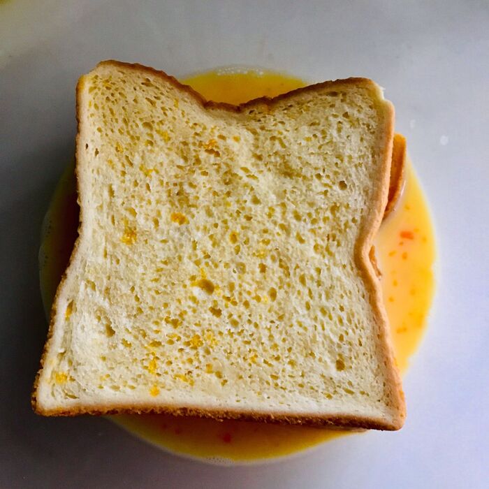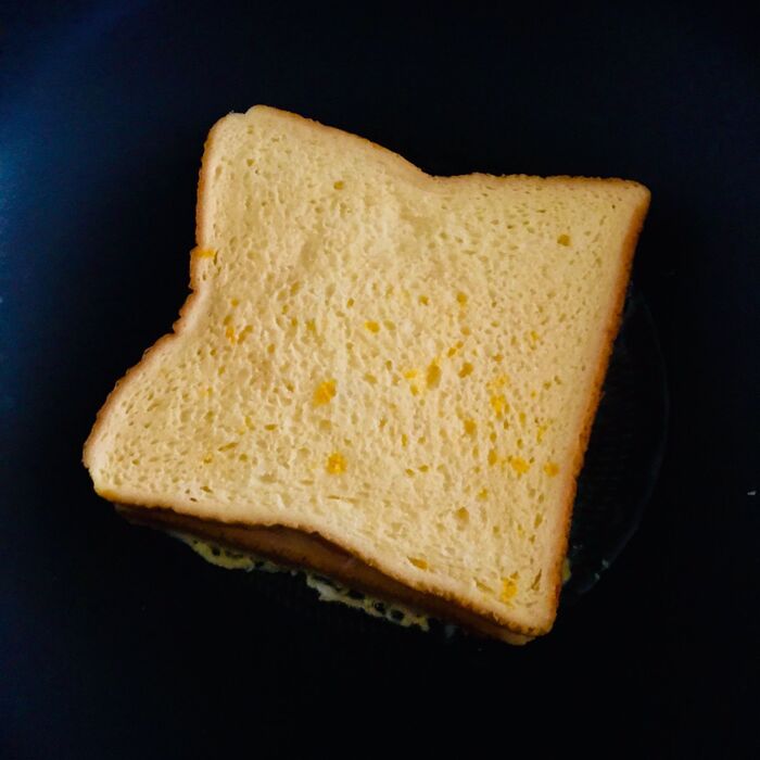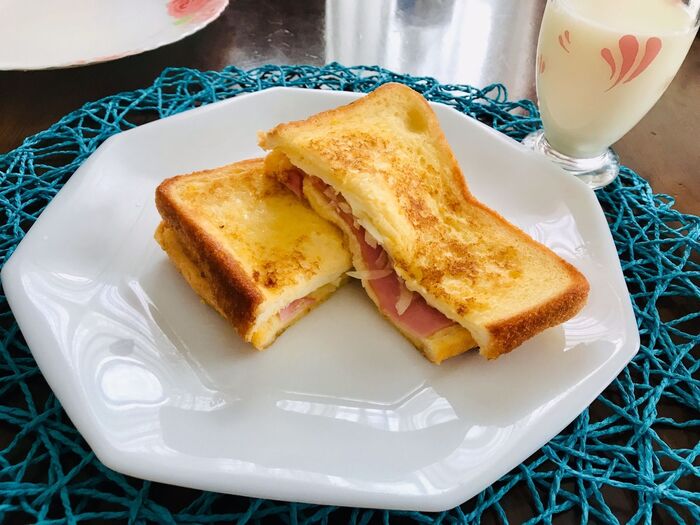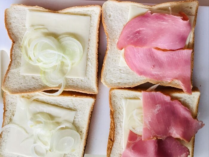 食パンにチーズ、玉ねぎ、ショルダーベーコンをのせ、もう1枚のパンではさみます。