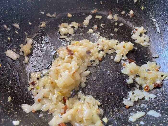 オリーブオイルで にんにく玉ねぎ 赤唐辛子を