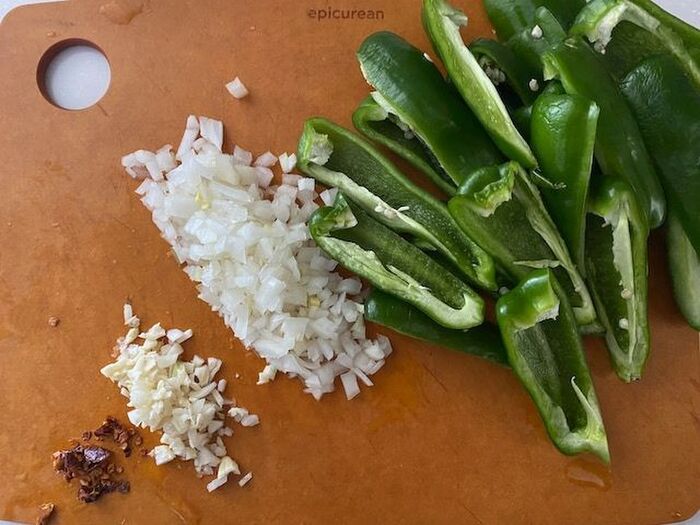 ピーマンはヘタと種をとり縦に4等分してにんにく