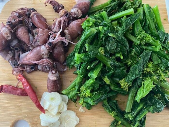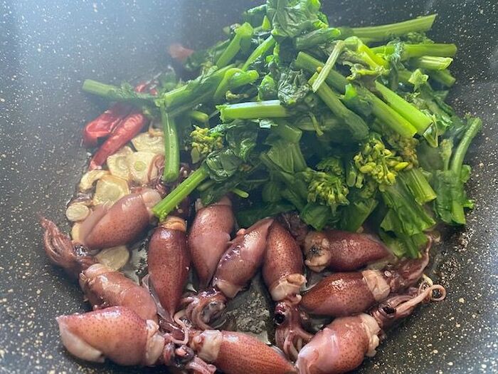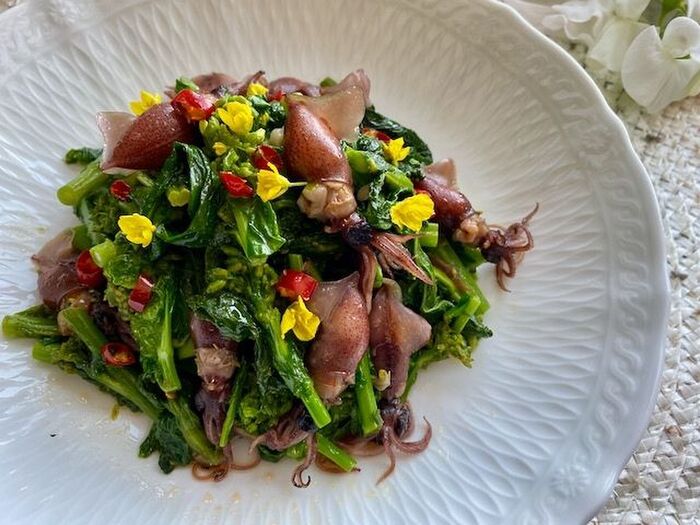 ホタルイカを加えオイルを絡ませたら菜の花を加える。
