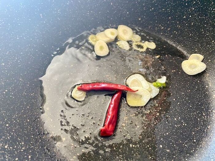 赤唐辛子を入れ香りが出たらアンチョビを溶かす。