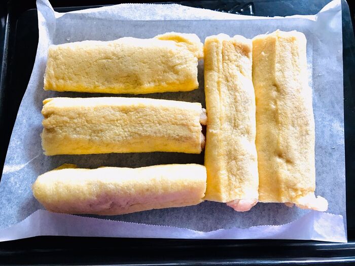 ③クルクルと巻き、巻き終わりを下にして天板に並べます。