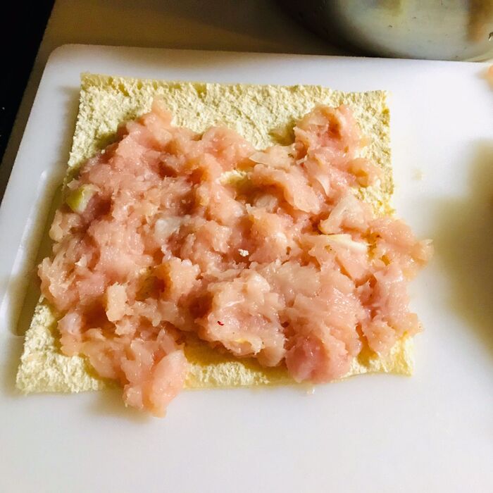 ②油揚げを麺棒で軽く叩いて端を切り、広げます。
