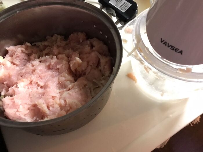 たまねネギも粗く切り、一緒に加えてミンチします。