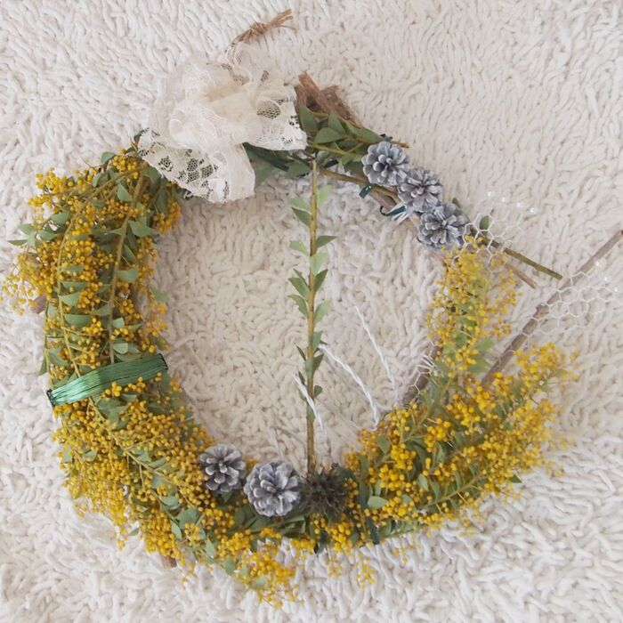 レース布で作ったフラワー、木の実やくるくるワイヤーを乗せます~