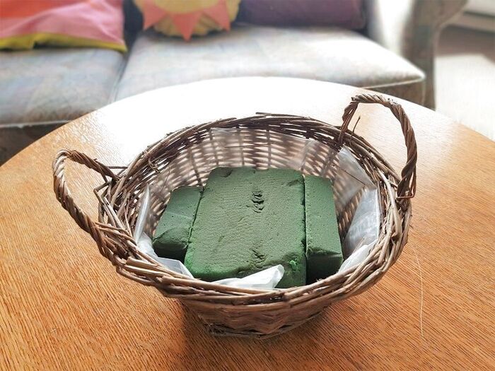 まず、フラワーアレンジメント用のカゴにオアシスを(適当に)敷き詰め、お水をたっぷり含ませます。