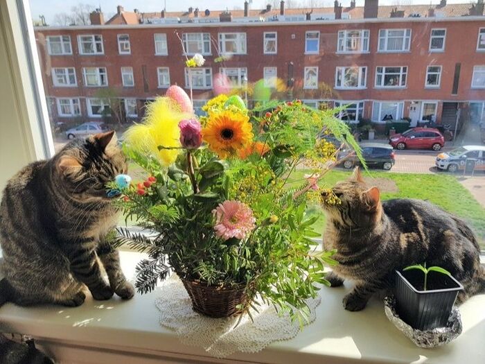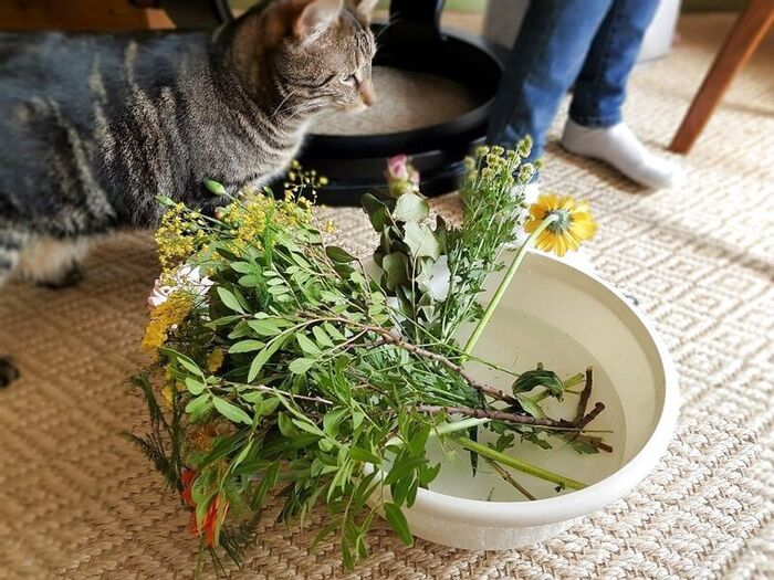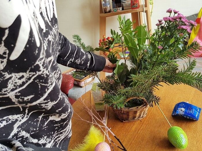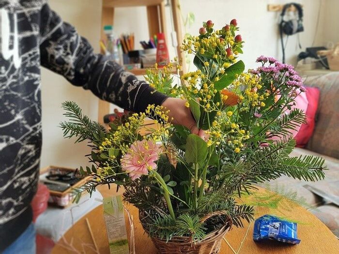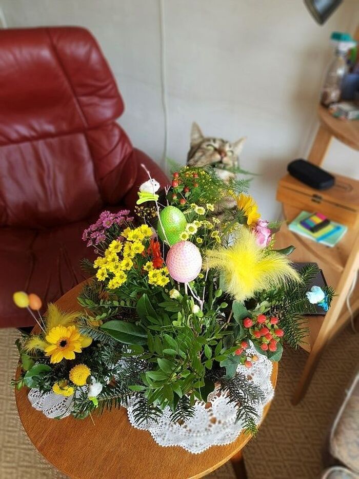 本当は、飾り用の卵やヒヨコのクリップだけを買い足したかったのですが、ロックダウンの影響でふら~っとお店に行けません。唯一ふら~っと入れるスーパーで花束を見て、ブーケをオアシスに差すというお手軽アイディアが閃きました。お飾り付きなのも嬉しい!