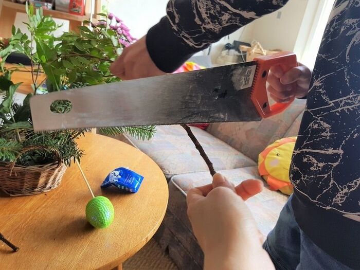 ときには、のこぎり登場。長すぎる枝をカットします。