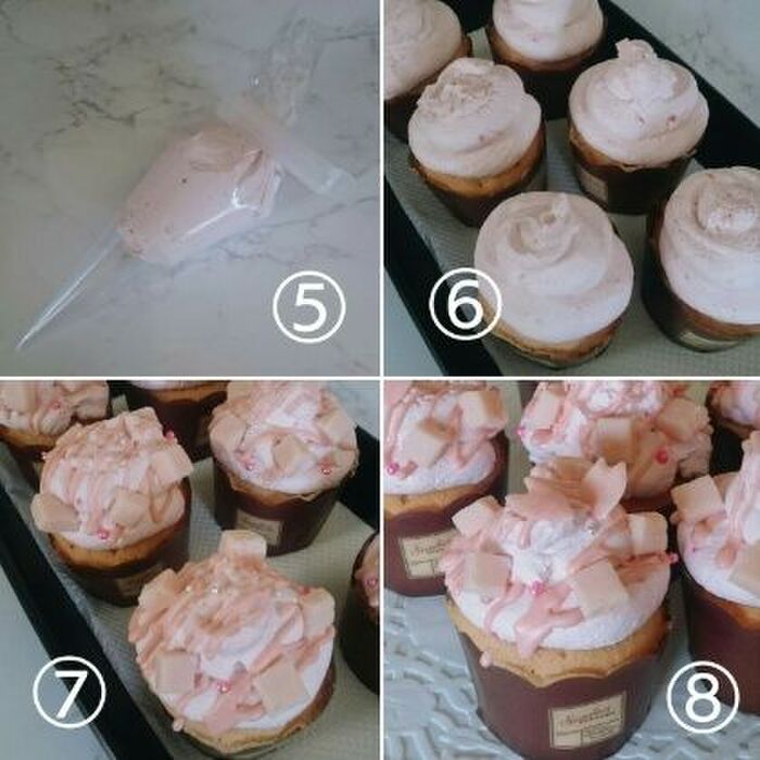 →焼いたカップケーキが十分に冷めたら、Aをボウルにいれてしっかりめにホイップし、絞り袋にいれます。(画像⑤参照)