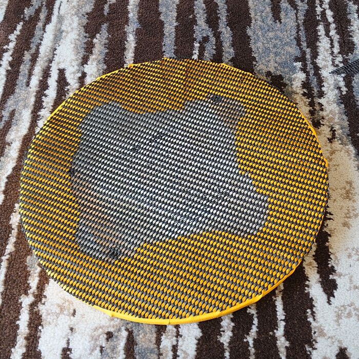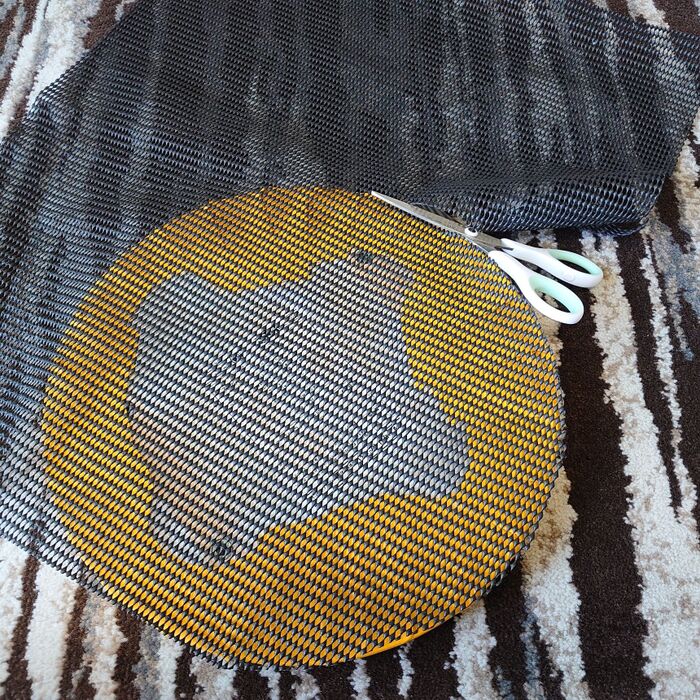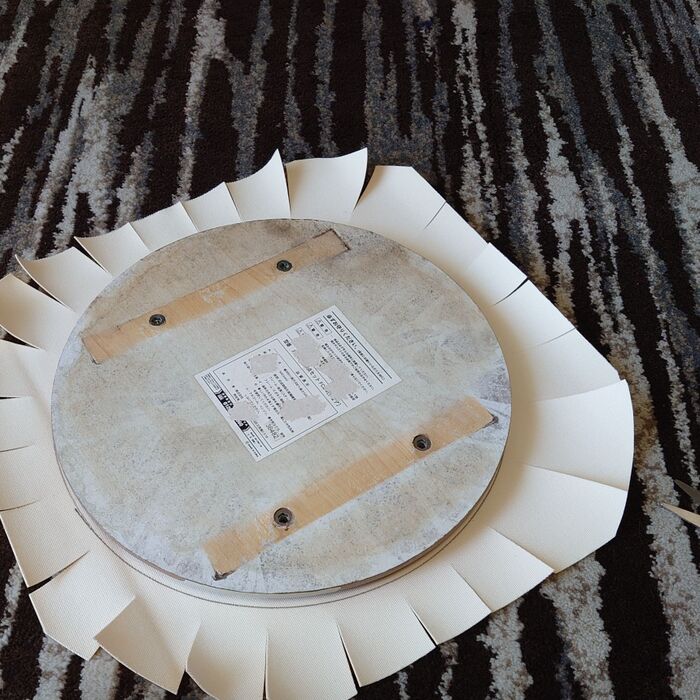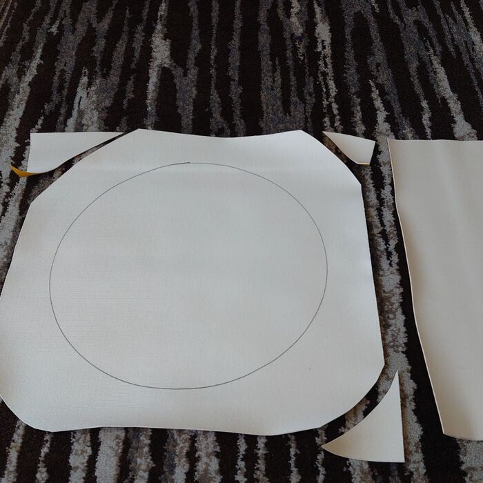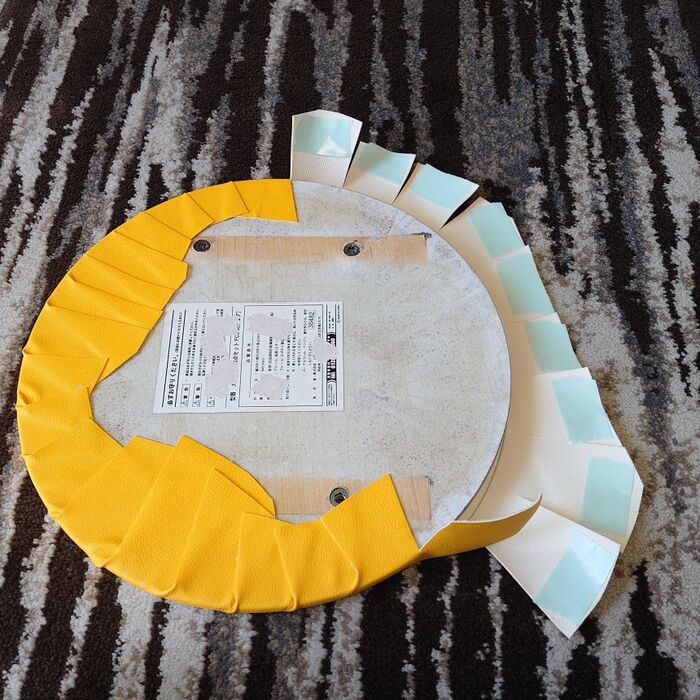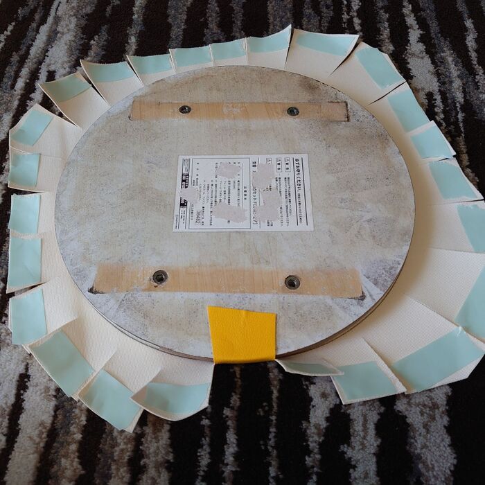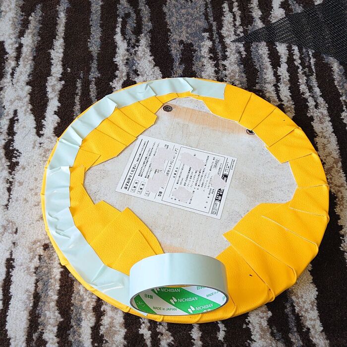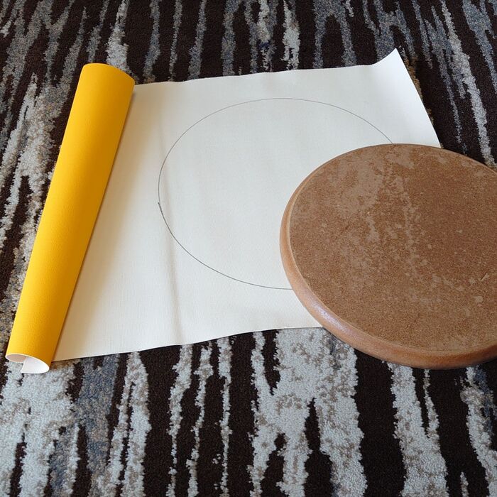 使わなくなって、外しておいた丸イスの天板と100円ショップで購入した合皮のハギレ。