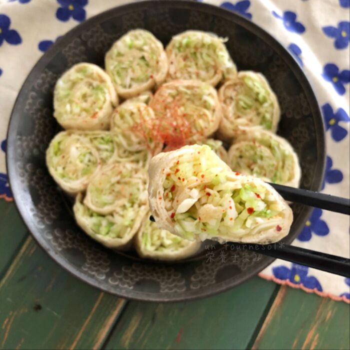 水気を絞ったキャベツと、切り落とした油揚げをのせて巻き、6等分に切りお皿に並べる。
