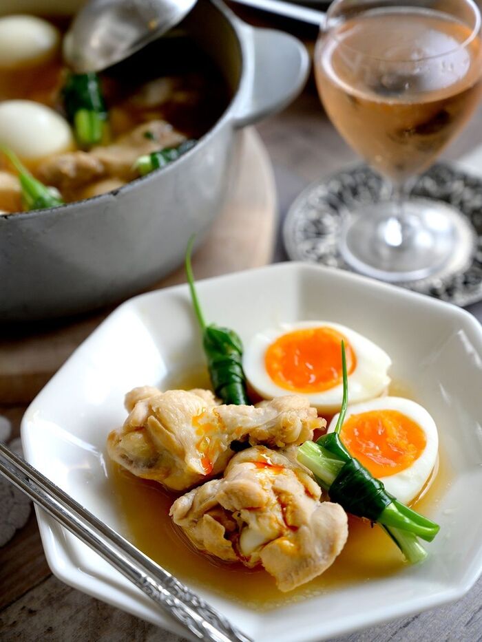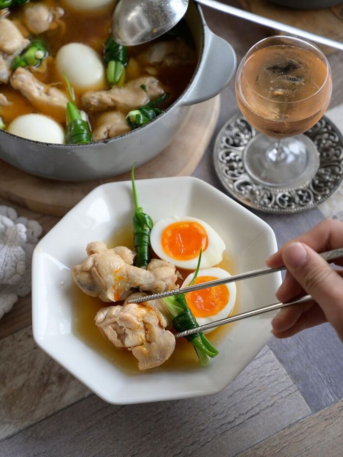 15分煮て火を止め一文字ぐるぐるにしたねぎをとゆで卵を加えしばし放置。
